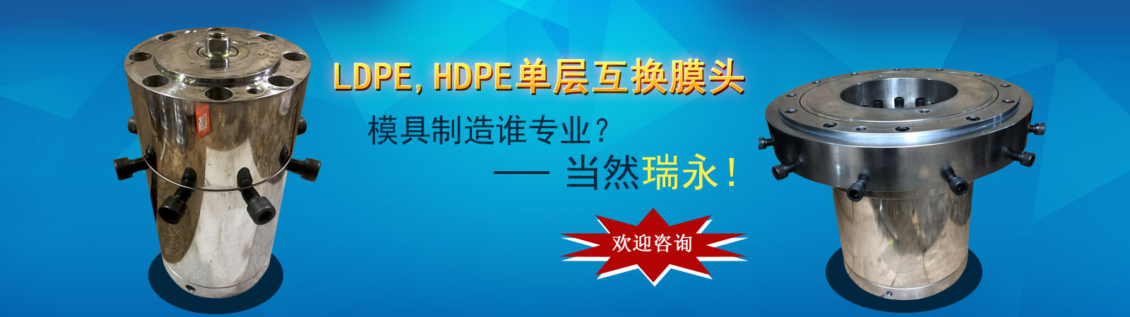 瑞安市瑞永模具有限公司是一家科研、制造、銷售、服務(wù)為一體的綜合性企業(yè)。專業(yè)生產(chǎn)各種規(guī)格的吹膜機膜頭、吹膜機三通、吹膜機風環(huán)、吹膜機旋轉(zhuǎn)器、吹膜機配件等相關(guān)配件的生產(chǎn)廠家;專注吹膜機模具也有15年歷史。